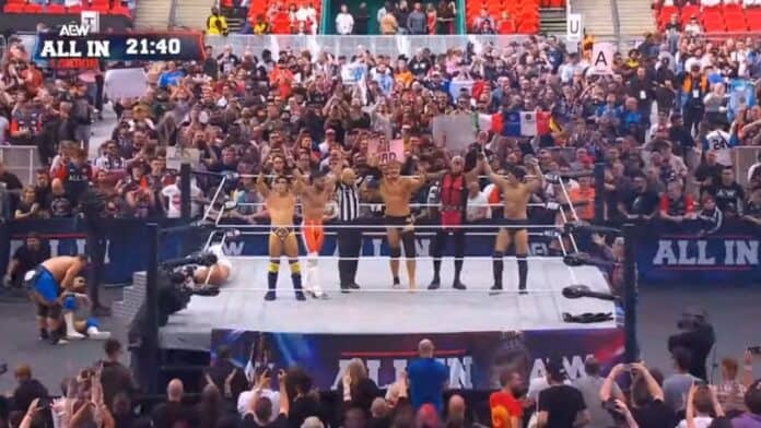 Dustin Rhodes, Sammy Guevara, The Von Erichs (Ross & Marshall) and Katsuyori Shibata vs. Brian Cage, Bishop Kaun, Toa Liona, Matt Taven & Mike Bennett took place at the AEW All In: London 2024 pay-per-view event from Wembley Stadium on Sunday afternoon.