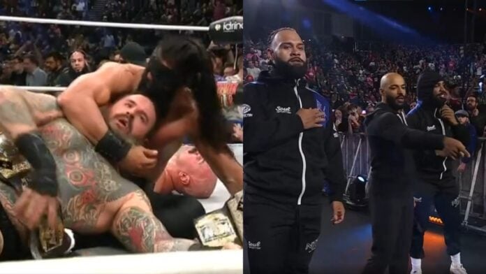 Ricochet & Gates of Agony wearing NJPW tracksuits and masks just attacked Hurt Syndicate.