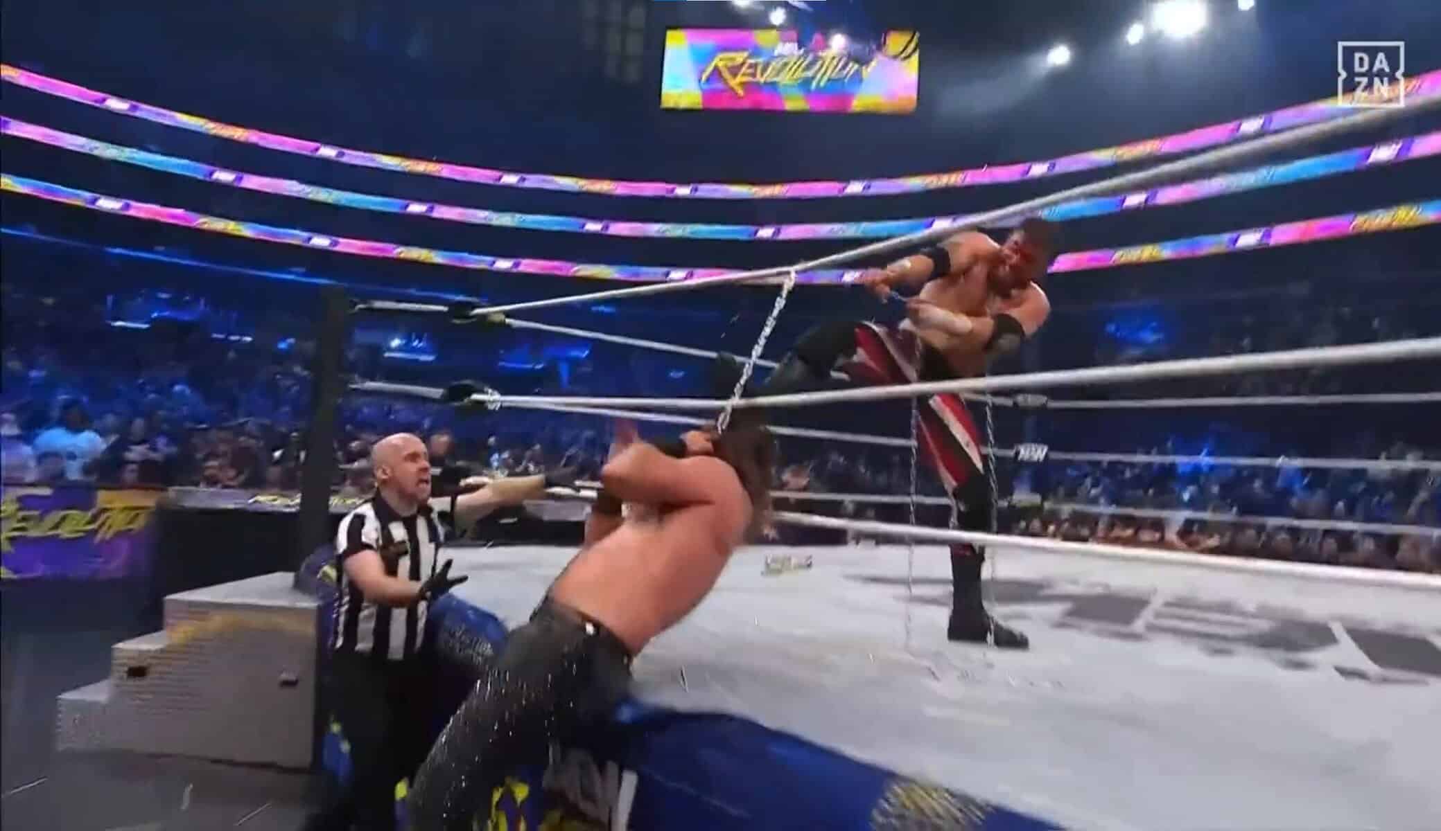 They started off brawling into the crowd and then back into the ring. MJF paid homage to Terry Funk with special tights. Page got a staple gun and then gave paper cuts to MJF and then stapled a happy birth card to MJF’s chest. Page brought in a window but MJF grabbed it and broke it. Page suplex MJF into the broken glass. Page dragged him through broken glass. Page got barbed wire and that sliced MJF open. Page got busted open then MJF put s syringe through the check of Page and then squirted liquid through it. Page did the dead eye on a barbed wire steel chair. MJF was tossed into a chair with barbed wire on it. Page did a moonsault off the top rope to the floor with a chair, but missed and MJF hit him with a chair. Page with dead eyes off the apron through a table. MJF with a tombstone off the apron through a table. They both grabbed light tubes before MJF started to walk up the ramp. Page hit him in the back with the light tube. They battled to get skewers and Page put it in the head of MJF then hit the buckshot lariat. Page got a dog collar for the both of them. Page got a table out then a barbed wire board on top of it outside the ring. MJF pulled him off the top rope to go through it. They crashed off the stage through a table that exploded. Back in the ring, Page went for a buckshot lariat, but MJF kicked him in the nuts. MJF with the belt shot. Page with a kick in the nuts then a belt shot. Page went for the buckshot lariat, but MJF hit him with a forearm shot then MJF choked him with the chain over the top rope and Page dropped and never reached the count of ten.