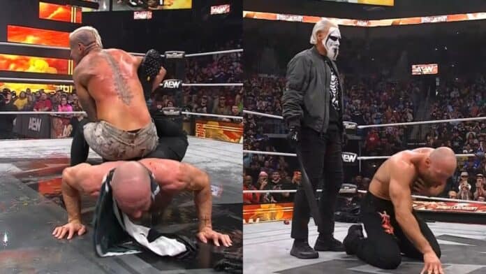 Moxley beat down Allin throughout the majority of this one to the point where Allin had a bloody mouth. Moxley stabbed Moxleyโs finger with one of the threw to try to pull up his fingernail. Darby choked Moxley with a rope over the top rope. Jon gouged the eye of Allin to get out of it. Moxley started whipping Allin with a belt. Allin sprayed lighter fluid into the eyes and all over Moxley. The rest of the Death Riders came out to the ring, allowing Moxley to hit a cutter to Allin. Moxley got a taser leading to Marina to hit a low blow to Allin and Moxley using it before hitting a taser. Moxley hit his finishing DDT onto a chair. Moxley had him in a headlock and Allin flipped him off. Claudio launched Allin out of the ring onto the announce table. Moxley with a DDT off the apron through a set of tables. Moxley was begging Allin to quit and argued to the referee that Allin was out of his mind. The Death Riders got an aqurim and set it up in the ring, so Moxley tried to drown Allin. The lights went out and when they came back on, Sting was there. He choked Moxley with the baseball bat then hit the Death Riders with it and broke the tank. Sting tossed the bat to Allin and left the ring. Allin hit Moxley with the bat several times then choked Moxley and hit the scorpion death drop and then coffin drop. Allin with the scorpion death lock for the win.ย