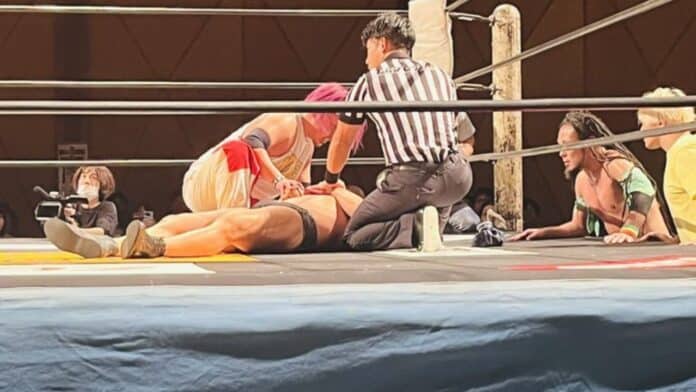 While wrestling today during Tenryu Project’s main event, he collapsed and the bout was called off. He was taken to the hospital, where he was diagnosed with a concussion. The good news is that he has since been released from the medical facility.