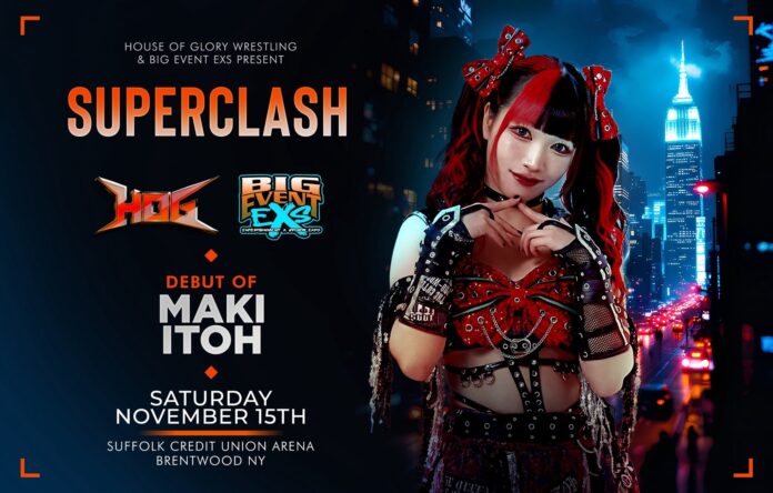 House of Glory (HOG) Wrestling has announced that Japanese wrestling star Maki Itoh will make her debut for the promotion at the “Superclash” event on Saturday, November 15th. The event, a collaboration between HOG and The Big Event EXS, will take place at the Suffolk Credit Union Arena in Brentwood, NY, marking the promotion’s Long Island debut.