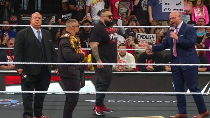 The World Heavyweight Championship has been declared vacant. Adam Pearce, alongside Bron Breakker, Bronson Reed, and Paul Heyman, opened the show in the ring. Breakker was holding the championship belt on his shoulder as Pearce delivered the news.