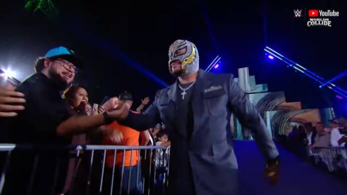 HERE COMES REY MYSTERIO!#WorldsCollide pic.twitter.com/ogqRs99tea
