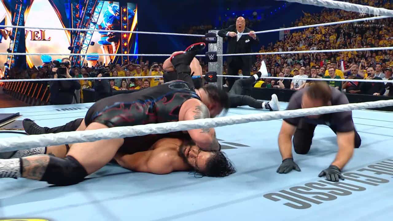 BRON BREAKKER APPEARS OUT OF NOWHERE AND SPEARS ROMAN REIGNS!!!#WWECrownJewel pic.twitter.com/aO8o2NpmHC