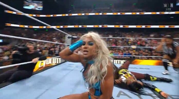Naomi acaba de destrozar el monitor de la mesa de comentaristas con esa Dropkick sobre Jade Cargil. Ese chispazo. #WWEEvolution pic.twitter.com/1QbLqeiV0U