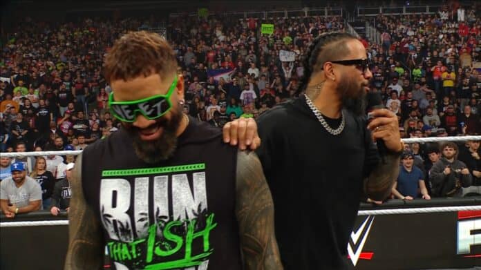 Jey then turned his attention to The New Day (Kingston and Woods), adding, “They do,” referencing their long and storied rivalry. As Kingston and Woods turned to face the Usos, they were quickly knocked out of the ring with punches from Jimmy and Jey.