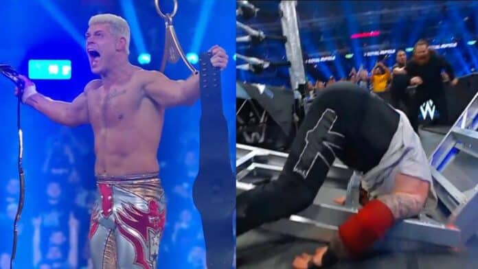 They started brawling before Owens powerslammed him onto a ladder in the entrance way. They brawled into the crowd. Owens used the camera as a weapon. Back at ringside, Owens tossed him onto a ladder. Owens used a step ladder as a weapon only for Rhodes to also use it. Rhodes tried to climb the ladder, but Owens stopped him with a ladder and then powerslammed him onto one. Rhodes busted off a piece of the ladder and used it as a weapon. Rhodes back dropped him onto a corner of a ladder that was put down. Owens powerbombed him into a ladder in the corner. Owens with a fisherman’s buster off the middle rope onto a ladder. Sami Zayn came out to check on Owens. Rhodes fired up and sent him head first into the ring post. Owens was busted open. Owens with a low blow before Rhodes hit an Albama slam off the announce table through a ladder and got the titles down.