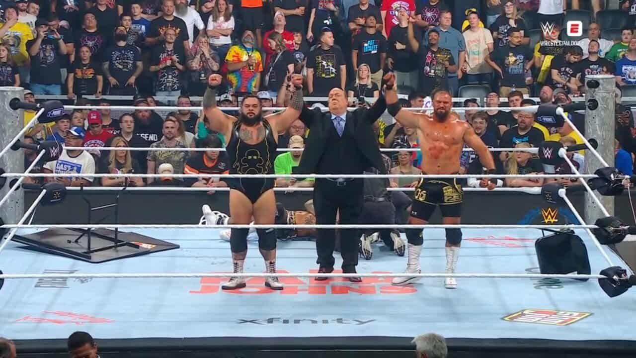 Jey hit an outside dive on the floor and Jimmy hit Bron with a chair while Knight simply didn’t care. Bron pulled the rope down and Jimmy went flying over the top rope to the floor. Bron with a launching shoulder tackle on the floor. Reed used chair shots on Jimmy while LA Knight didn’t care. Jey got the hot tag and started hitting signature moves including a back splash in the corner. Jey with a head kick and crossbody to Bron for 2. The heels jumped The Usos and set up a table in the corner. The Usos with the 1D for 2 on Bron. Reed missed a moonsault off the top rope and Jimmy hit a front senton off the top rope to him. Bron cleared out Jimmy with a spear before Jey laid out Bron with a splash off the top rope for 2. Jey with a superkick to Bron then nearly hit LA Knight with a chair, but didn’t. Bron with a spear to Jey. Jey was bleeding badly from his face. Bron with a double spear to The Usos through a table. Reed with a splash to Jey for the win.